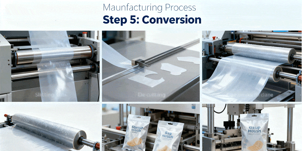This final production stage involves converting film into packaging bags using specialized bag-making machinery, enabling the creation of a diverse range of bag types. Subsequently, holes can be punched according to specific bag requirements. Alternatively, small components such as zippers, handles, or spouts can be added.
